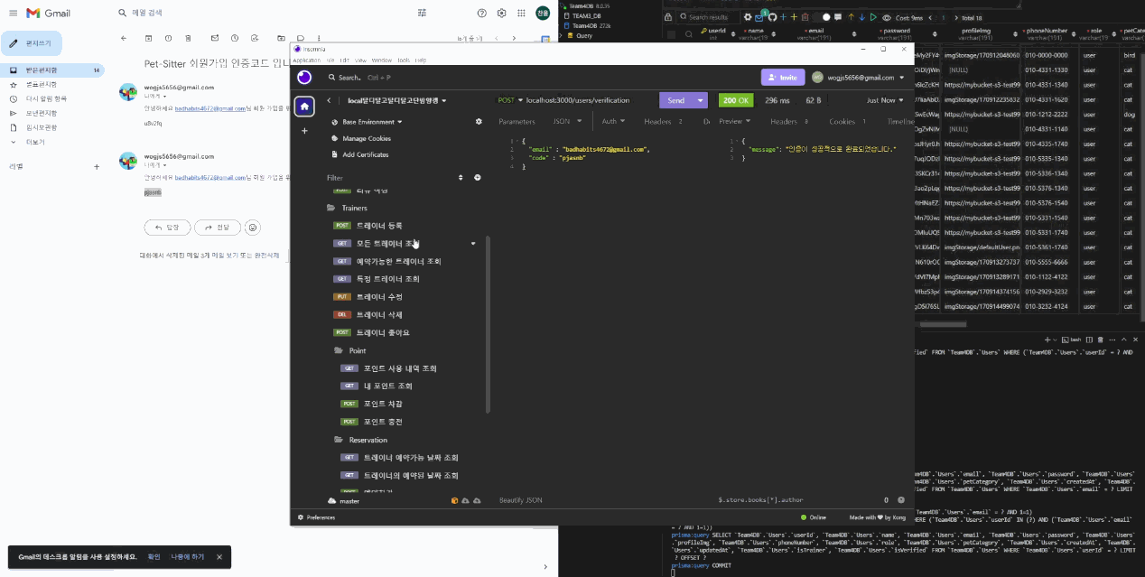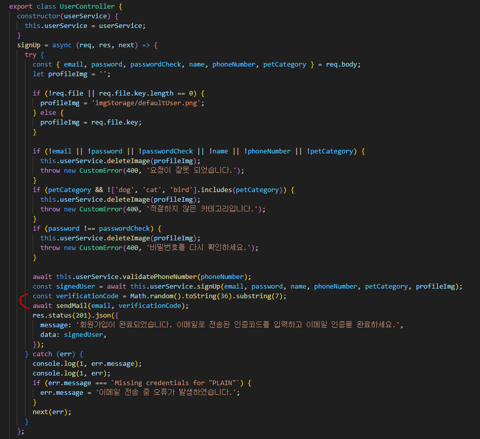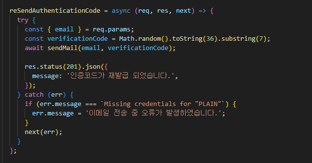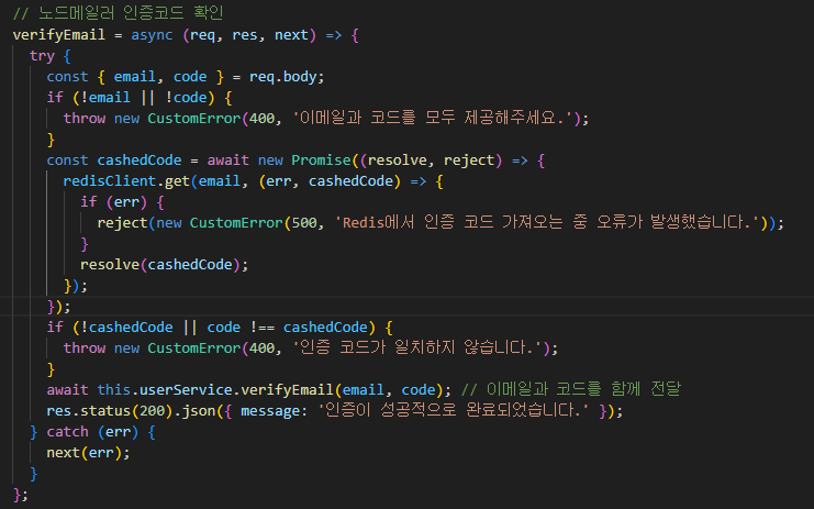 따로 디비에 저장해두지 않고 body에서 받은 코드와 비교해 이메일 인증 절차가 완료됨