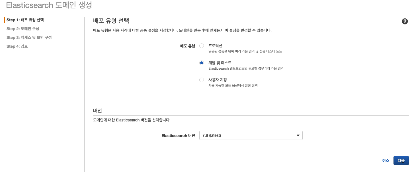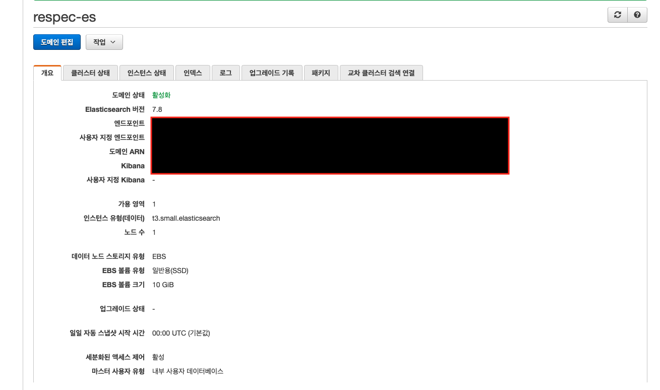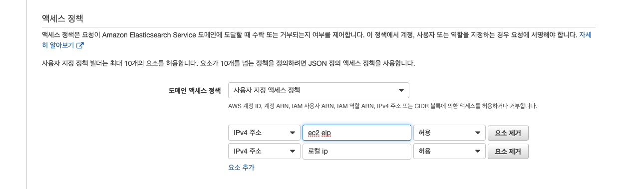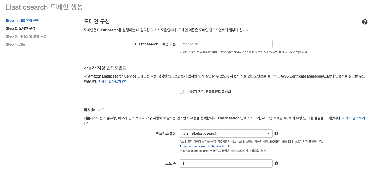 인스턴스 유형은 프리티어로 사용이 가능한 t3.small.elasticsearch를 선택해주었고, 노드 수는 기본값은 1로 설정해주었습니다.
