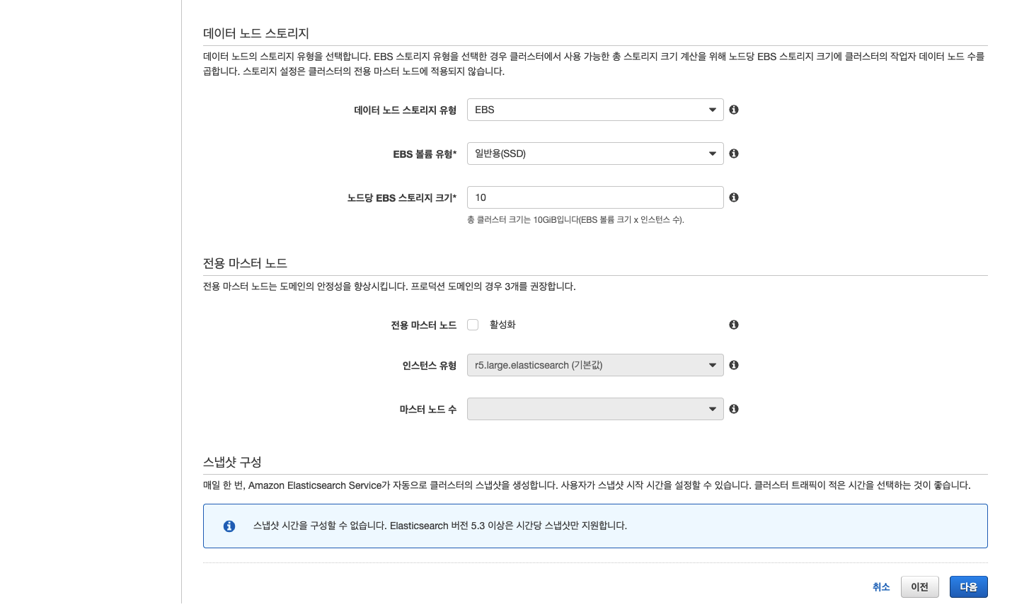 4. 데이터 노드 스토리지의 노드당 EBS 스토리지 크기는 최소 크기인 10으로 선택하였습니다.
