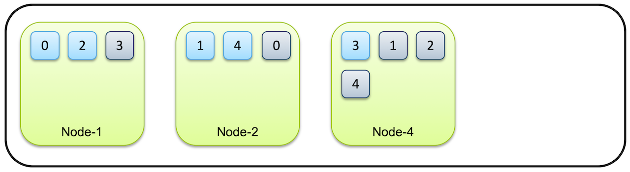 5개의 프라이머리 샤드와 각 1개의 복제본, 총 10개의 샤드들이 전체 노드에 골고루 분배되어 저장되어 있다. 같은 샤드와 복제본은 동일한 데이터를 담고 있으며, 반드시 서로 다른 노드에 저장 된다.